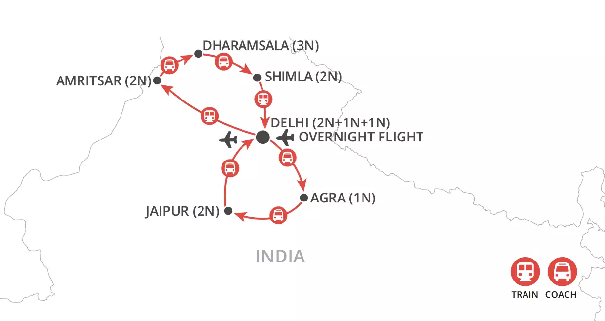 Place to visit: UK - Delhi (4N) - Agra (1N) - Jaipur (2N) - Amritsar (2N) - Dharamsala (3N) - Shimla (2N) - Delhi - UK