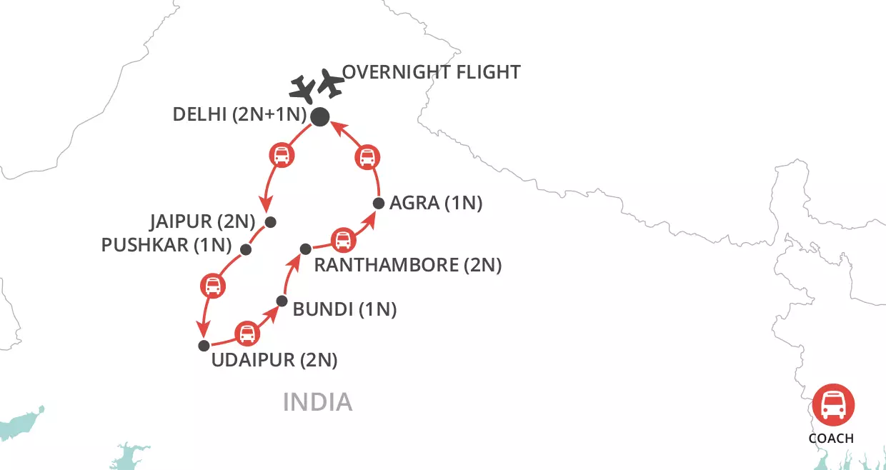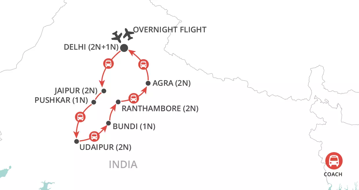 Place to visit: UK - Delhi (2N) - Jaipur (2N) - Pushkar (1N) - Udaipur (2N) - Bundi (1N) - Ranthambore (2N) - Agra (2N) - Delhi (1N) - UK
