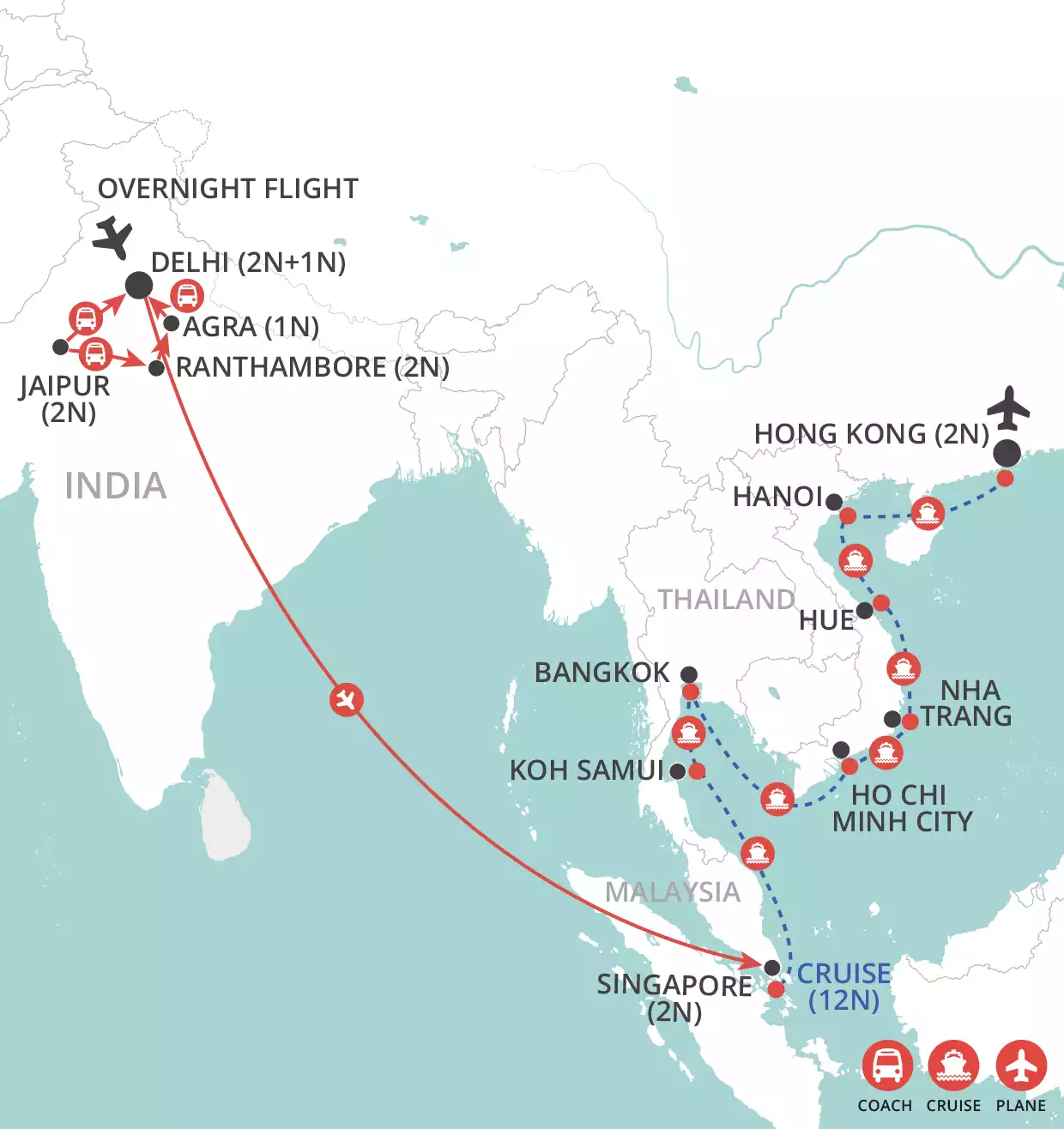 Place to visit: UK – Delhi (2N) – Agra (1N) – Ranthambore (2N) – Jaipur (2N) – Delhi (1N) – Singapore (2N) – Celebrity Cruises (12N) – Hong Kong (2N)