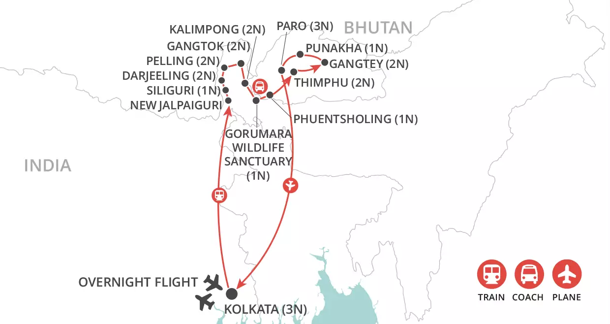 Place to visit: UK - Kolkata (3N) - Siliguri (1N) - Darjeeling (2N) - Pelling (2N) - Gantonk (2N) - Kalimpong (2N) - Gorumara (1N) - Phuentsholing (1N) - Thimphu (2N) - Gangtey (2N) - Punakha (2N) - Paro (2N)- Kolkata - UK