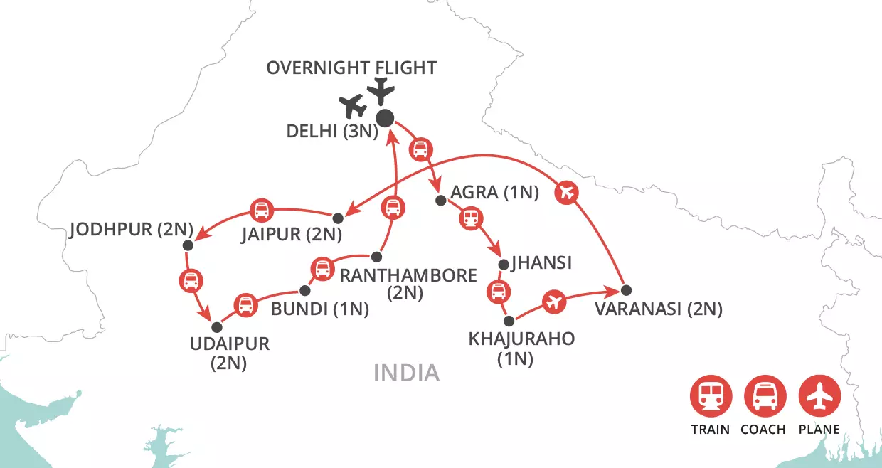 Place to visit: UK - Delhi (3N) – Agra (1N) – Khajuraho (1N) - Varanasi (2N) – Jaipur (2N) - Jodhpur (2N) – Udaipur (2N) – Bundi (1N) – Ranthambore (2N) – Delhi - UK