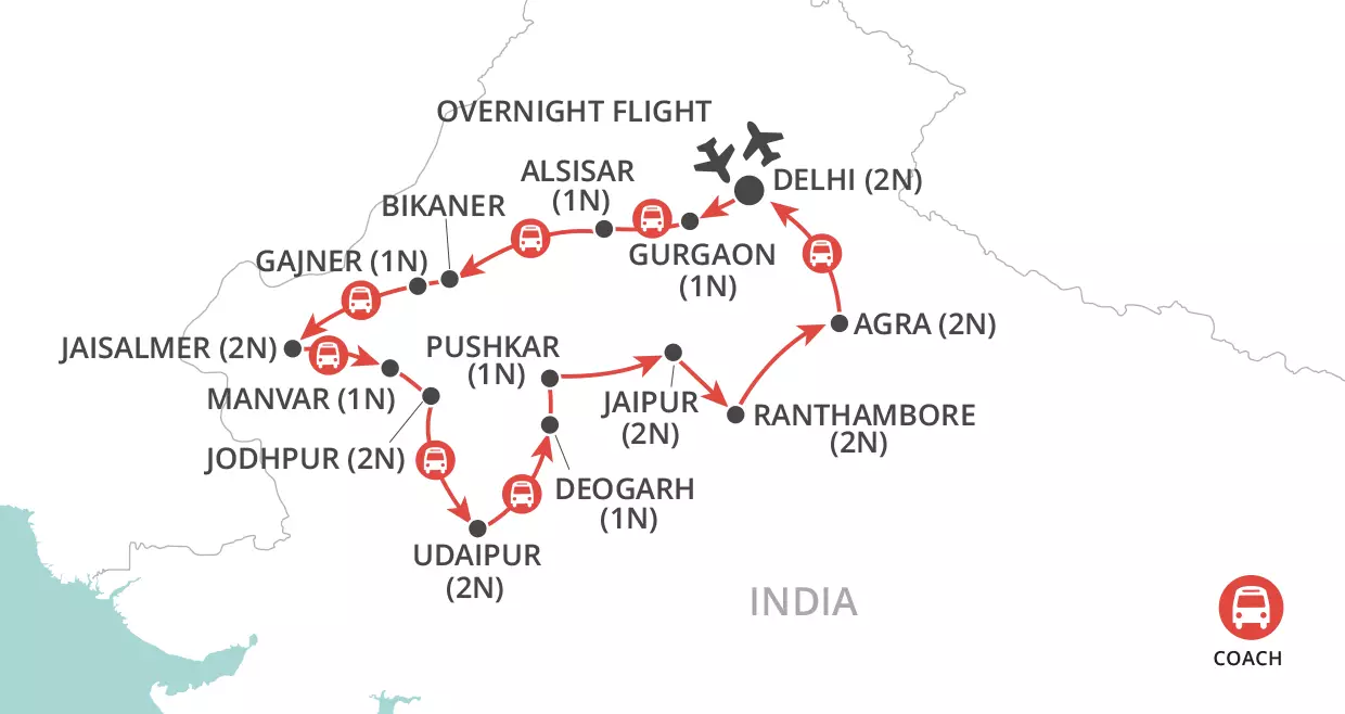Place to visit: UK - Gurgaon (1N) - Alsisar (1N) - Gajner (1N) - Jaisalmer (2N) - Manvar (1N) - Jodhpur (2N) - Udaipur (2N) - Deogarh (1N) - Pushkar (1N) - Jaipur (2N) - Ranthambore (2N) - Agra (2N) - Delhi (2N) - UK