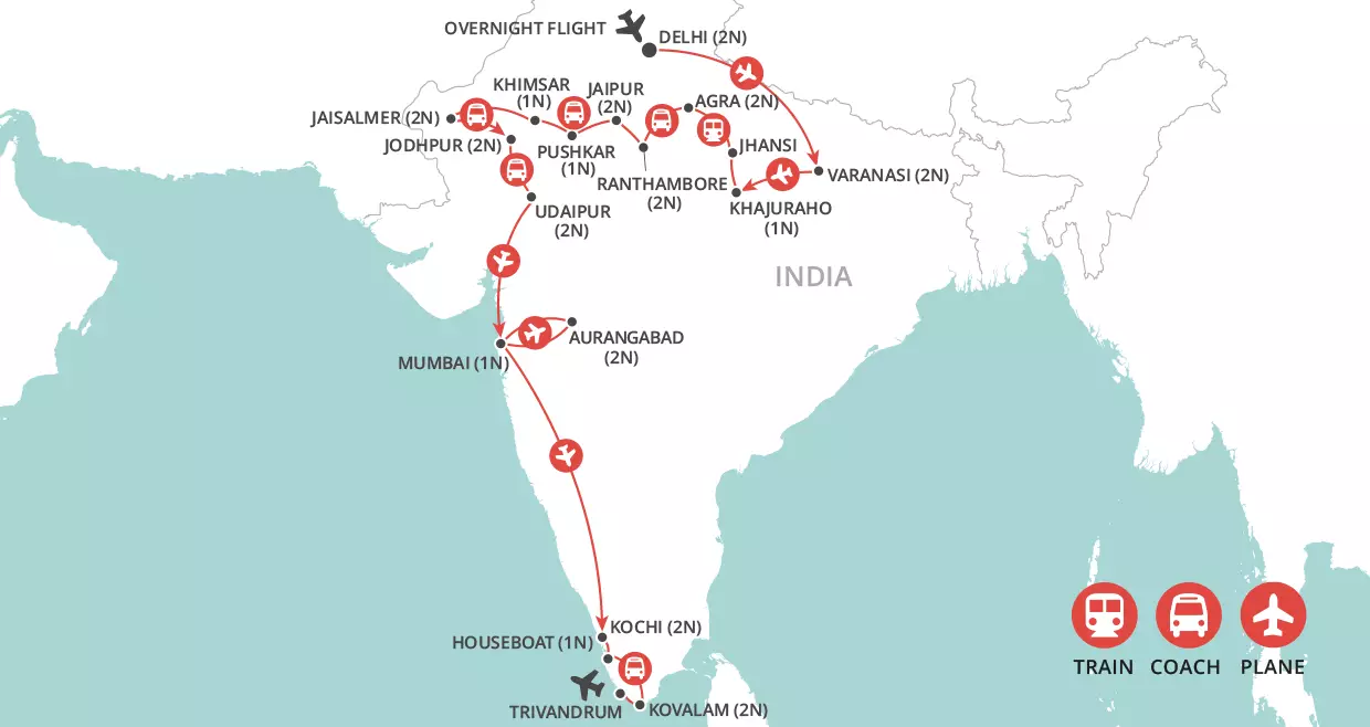 Place to visit: UK - Delhi (2N) - Varanasi (2N) - Khajuraho (1N) - Agra (2N) - Ranthambore (2N) - Jaipur (2N) - Pushkar (1N) - Khimsar (1N) - Jaisalmer (2N) - Jodhpur (2N) - Udaipur (2N) - Mumbai (1N) - Aurangbad (2N) - Kochi (2N) - Houseboat Cruise (1N) - Kovalam (2N) - UK